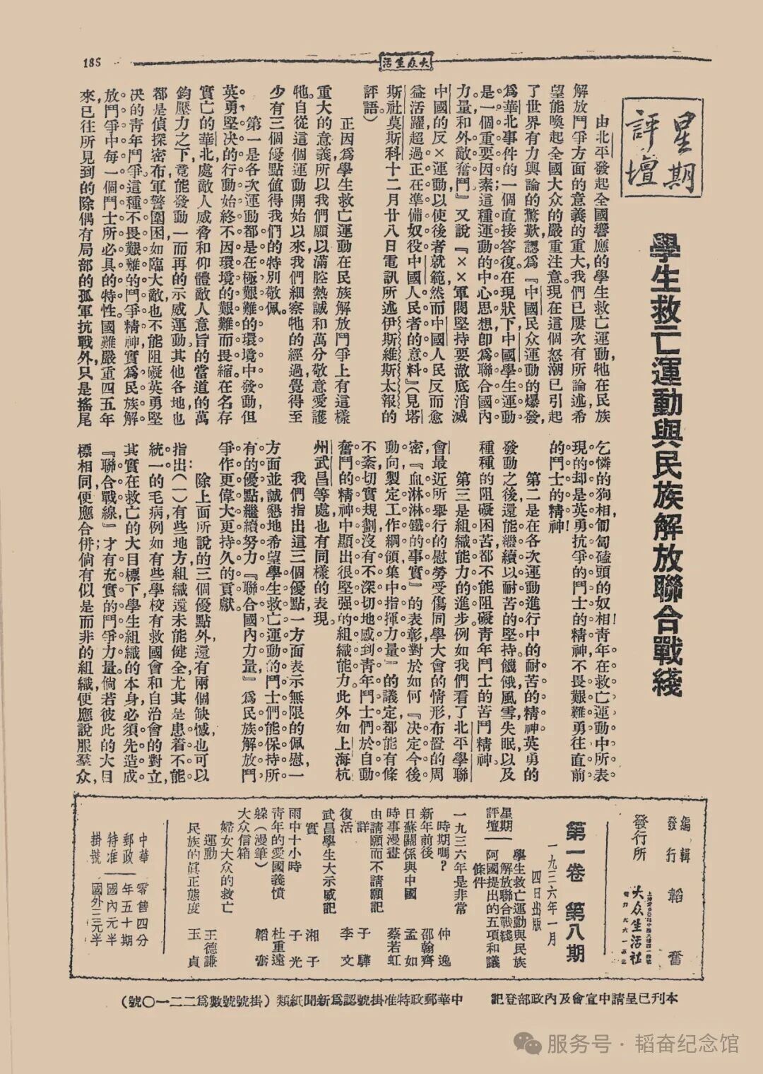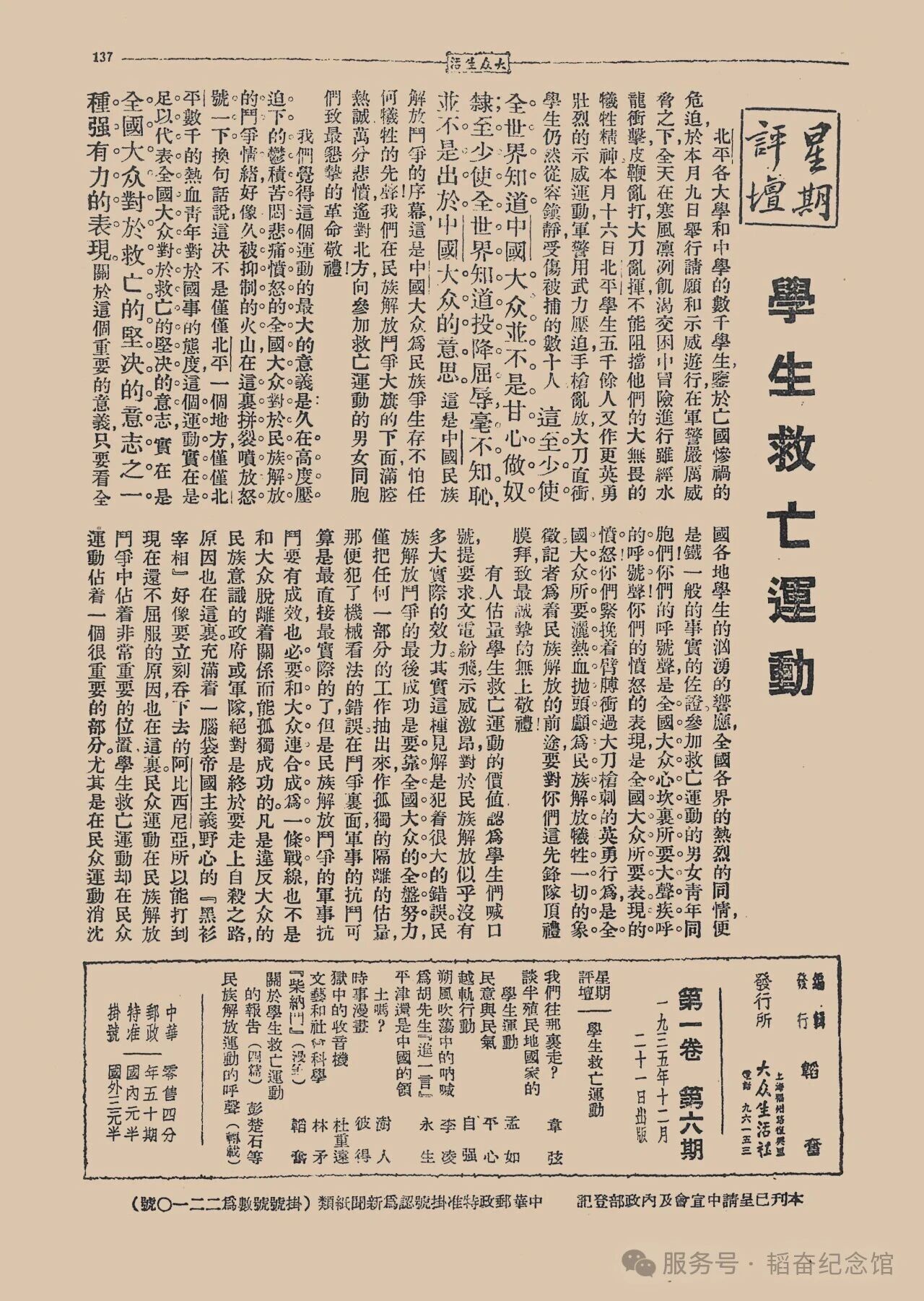 从第一卷第六期起,《大众生活》几乎所有篇目都在支持一二·九运动,刊登相关评论以及学生和读者的来信、通讯和照片,高度赞扬了这场爱国运动。韬奋在当期的《学生救亡运动》一文中提到: