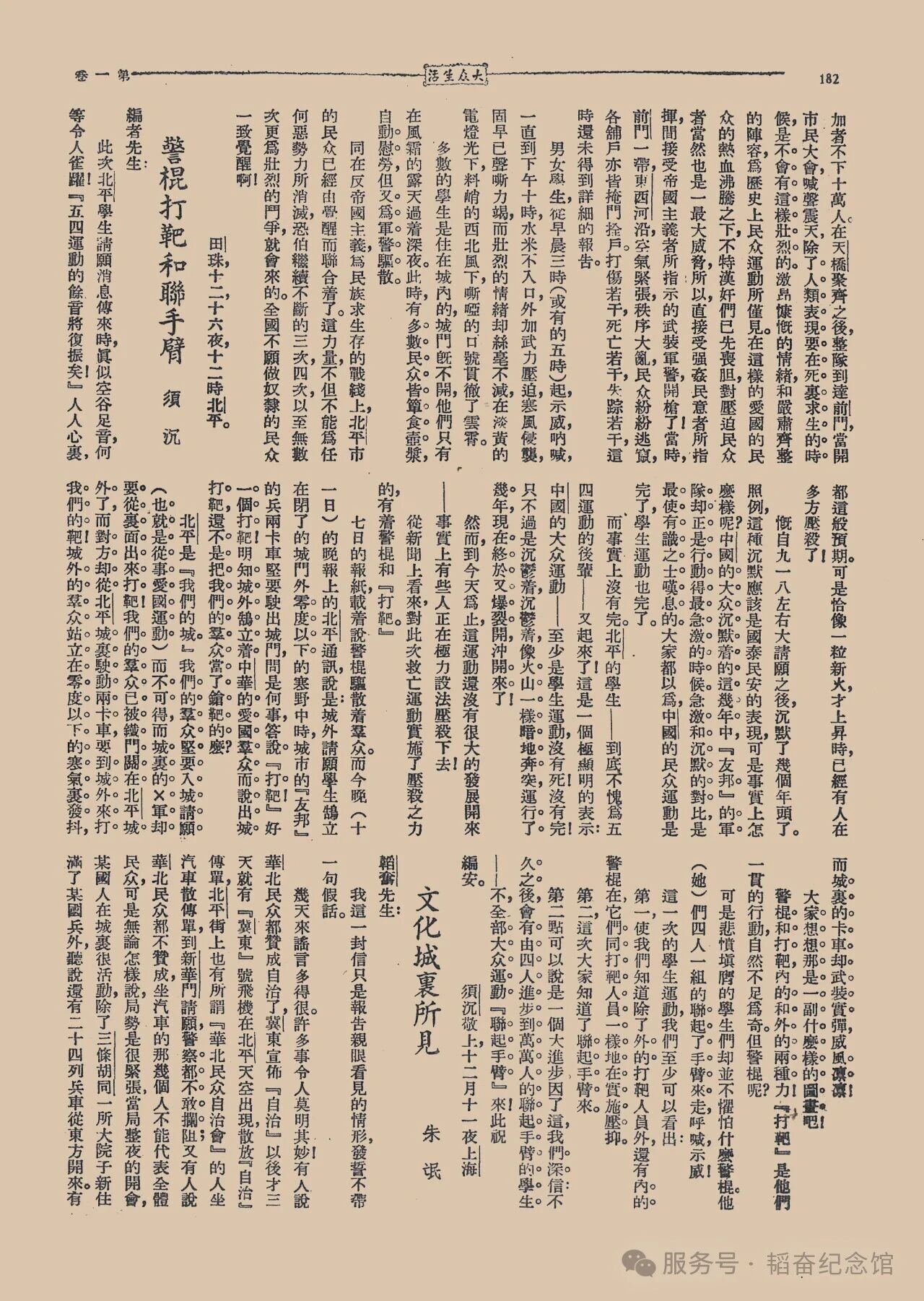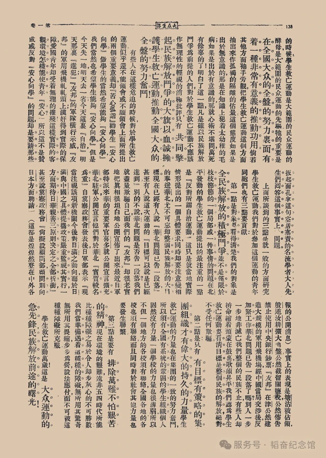 ……这是中国民族解放斗争的序幕,这是中国大众为民族争生存不怕任何牺牲的先声!……只有共同擎起民族解放斗争的大旗以血诚拥护学生救亡运动,推动全国大众的全盘的努力奋斗!学生运动万岁!这是大众运动的急先锋,民族解放前途的曙光!