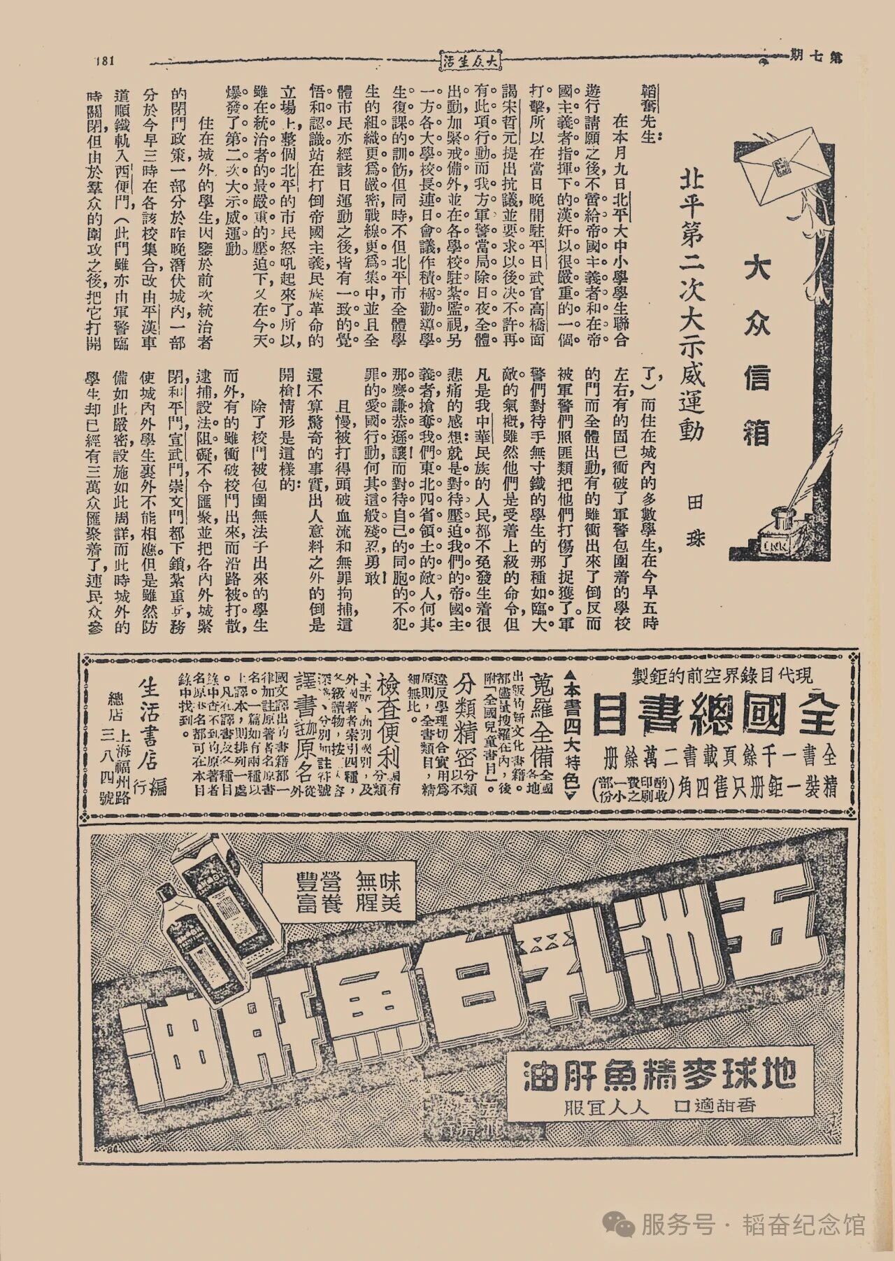 《大众生活》还采用刊登亲历运动的学生来信的方法还原现场,使报道具有更强的人情味和震撼力,也丰富了报道的视角。