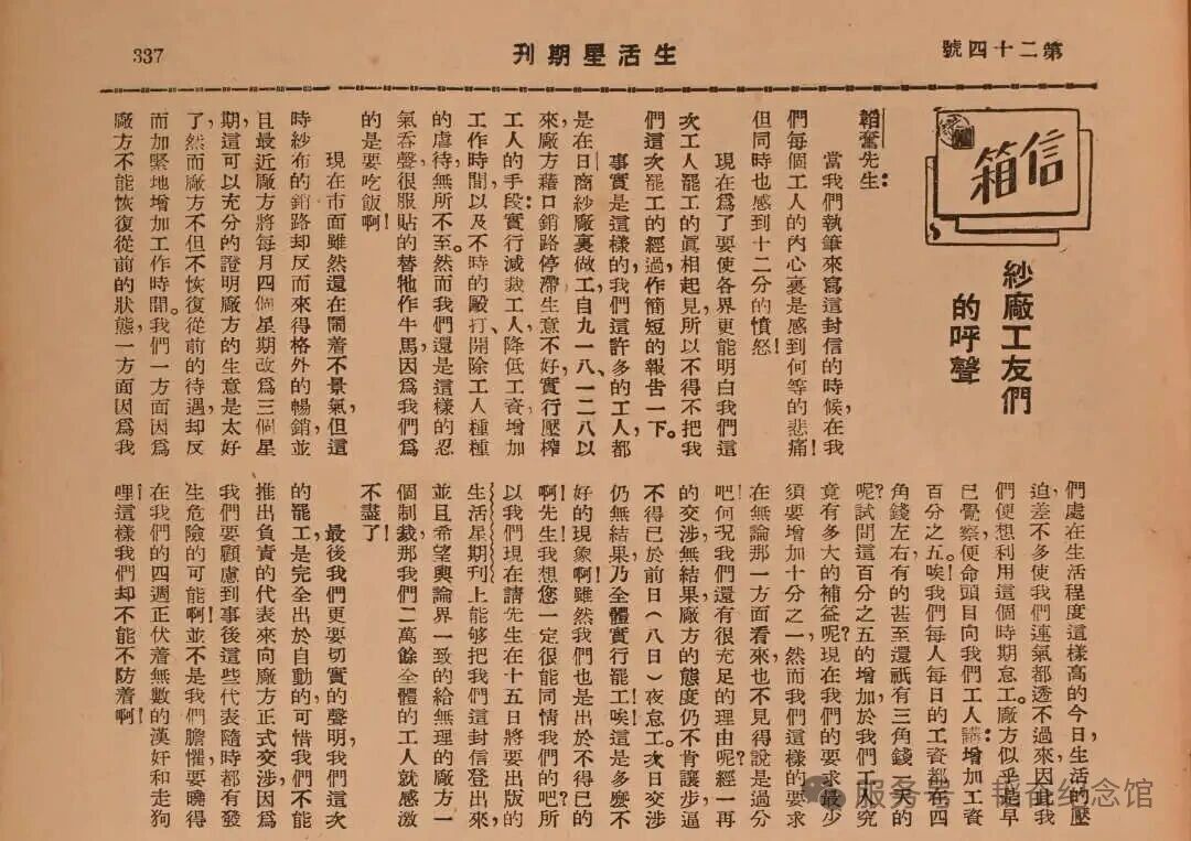 《生活星期刊》信箱专栏上刊载的《纱厂工友们的呼声》一文