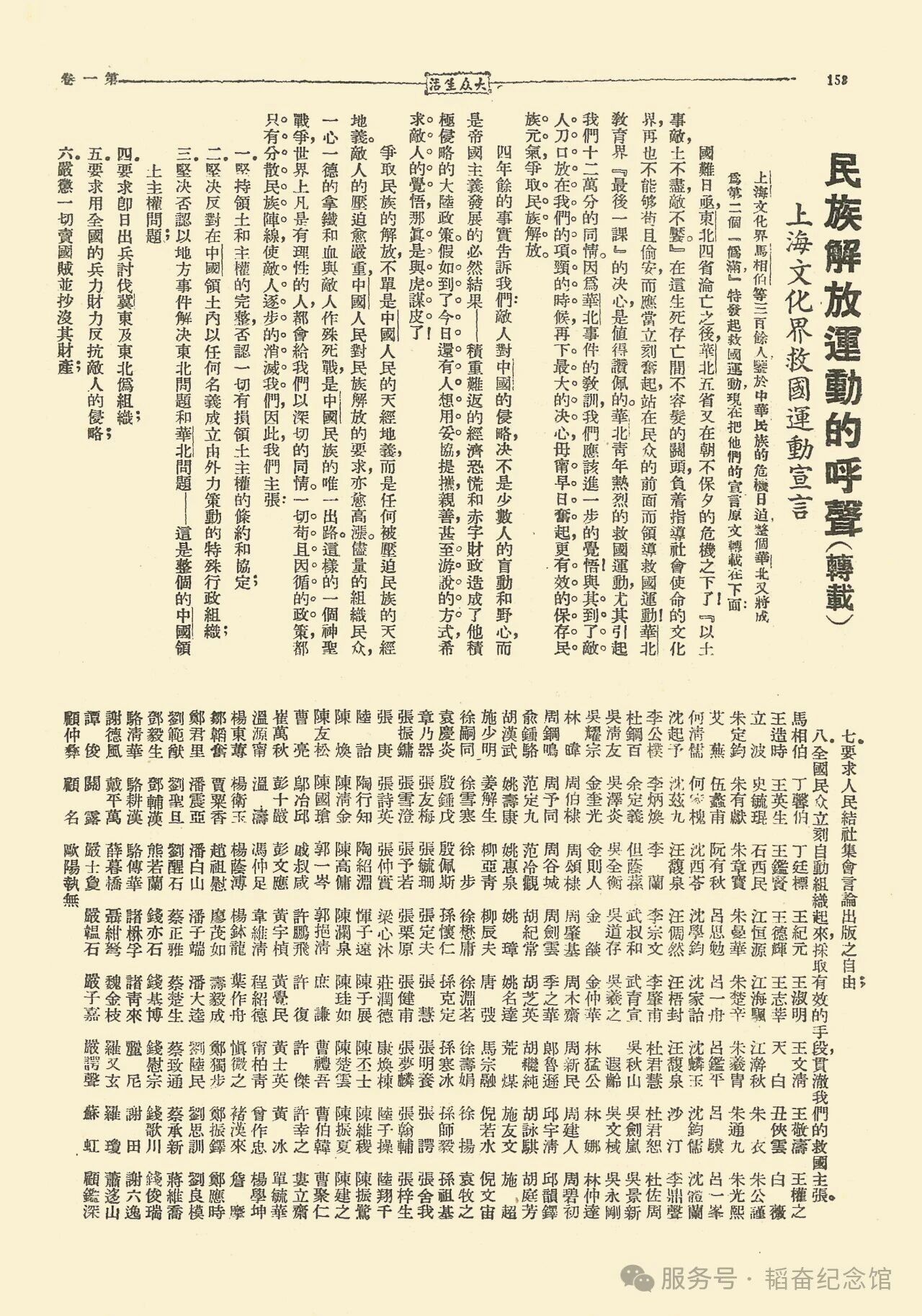刊登在《大众生活》上的《上海文化界救国运动宣言》
