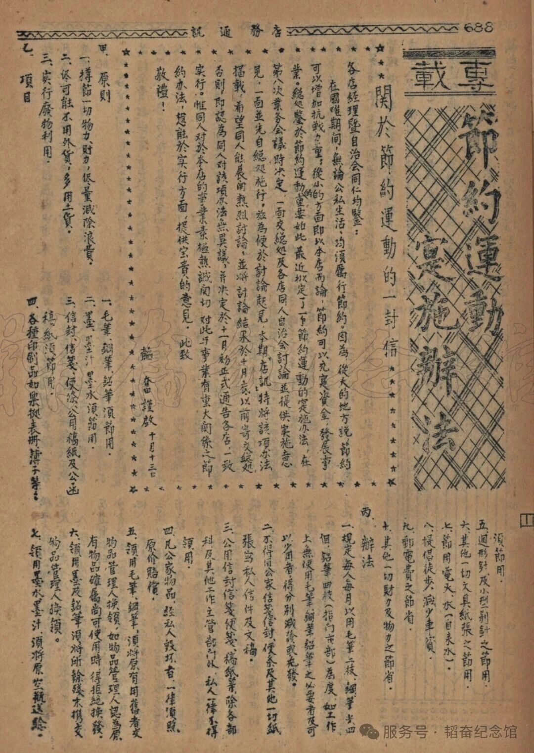 在国家危难之际,韬奋在书店内部发起“节约运动”,从一支笔、一张纸、一度电做起,制定详尽办法,倡导“节约等于生产、浪费就是罪恶”。