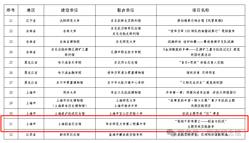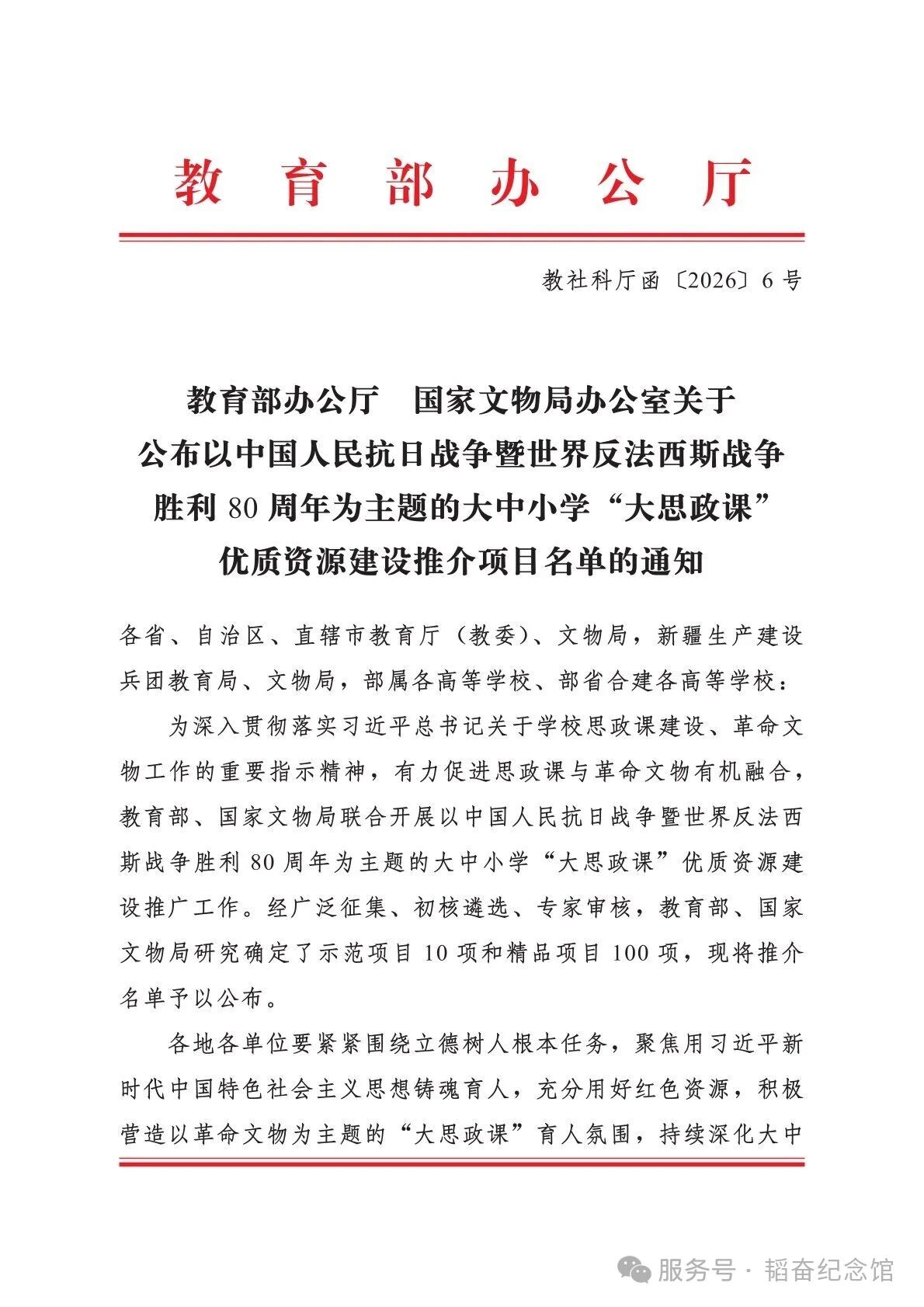 喜报传来!近日,教育部办公厅、国家文物局办公室联合公布以中国人民抗日战争暨世界反法西斯战争胜利80周年为主题的大中小学“大思政课”优质资源建设推介精品项目名单,韬奋纪念馆联合华东师范大学第二附属中学打造的“‘笔柄千秋唤救亡——韬奋与抗战’主题思政实践教学”项目成功入选。